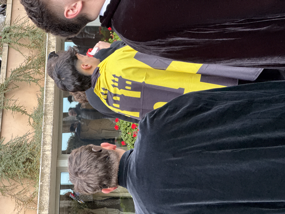 The image depicts a street scene in Monistrol de Montserrat, Spain, focusing on the backs of several individuals. In the foreground-midground, three people are visible. The person on the left has short, dark, wavy hair and wears a dark, possibly velvet, cloak. A beige hearing aid or similar device is affixed behind their right ear. The central figure, with dark hair styled in a fade haircut, is draped in a yellow and black flag featuring a black triple-towered castle emblem. This individual holds a partially visible white object in their right hand. To the right, the shoulder and upper back of a third person are visible, also clad in a dark, velvet-like garment. The background consists of a building with a light-colored, textured upper facade from which green trailing foliage descends. Below this, a planter box contains red geraniums. Further down, large reflective windows reveal distorted reflections of people and what appear to be carved stone figures or statues inside the structure. The individuals in the foreground are standing, facing away from the viewer, suggesting they are observing an event or specific area ahead of them.
