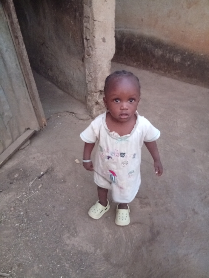 A young child stands on a gray concrete surface in front of a building with a rough exterior. The child wears a white, short-sleeved garment and white shoes. A bracelet adorns their left wrist, and they hold a thin object in their right hand. The background suggests an outdoor setting, possibly near a residence or building structure with rustic elements. The child gazes forward with a slightly curious expression.