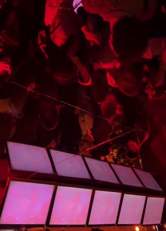 The scene takes place in a bar or event space with a lively atmosphere. A bank of seven screens displays a person singing or performing. The screens are mounted low, at head height of the people in the foreground, and angled slightly upward. The foreground is filled with people, some of whom are looking at the screens and others who are obscured. The space is lit with red and orange lighting, creating a warm and energetic atmosphere. Above the screens, a mirrored ceiling reflects the crowd, creating a sense of a packed and energetic space. There are hanging lights or decorations visible in the reflection.