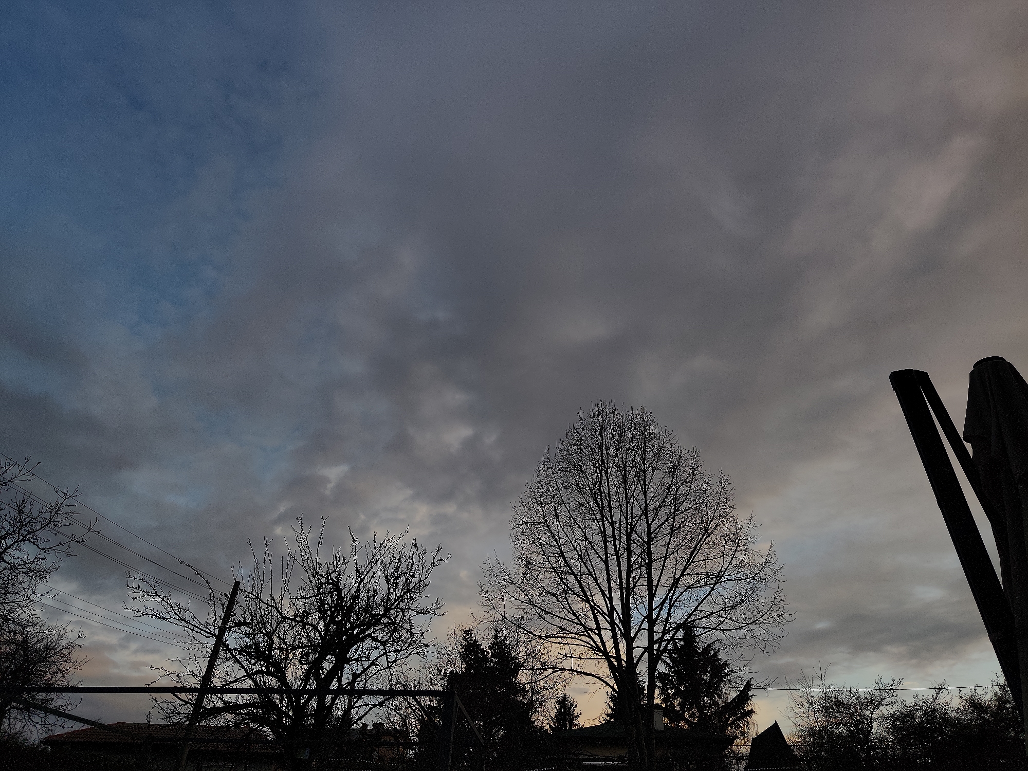 The image depicts a cloudy sky above a silhouetted treeline, likely at dusk or dawn. The sky transitions from blueish-gray to a warmer gray-yellow hue. Bare trees are prominently featured in the foreground, with power lines visible on the left. In the right foreground, dark vertical shapes resembling poles or supports are present. The lower portion of the frame reveals dark shapes suggesting rooftops and dense foliage. Based on the prompt, this location is in Novi Han, Bulgaria. There is no evidence of people, actions, or interactions in the scene.