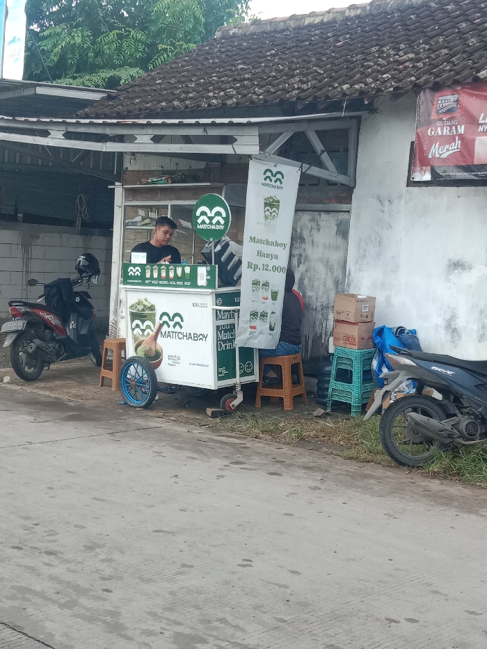 A small "MATTCHABRY" matcha drink stand is set up roadside, with a worker behind it. The stand is white, branded with the "MATTCHABRY" logo, and features a menu. A banner displays "Matchaboy Hanya Rp. 12.000" (Matchaboy Only Rp. 12,000). A blue decorative wheel is affixed to the side. A customer sits on a stool. Two motorbikes are parked beside the stand. A house with a tiled roof provides a backdrop. A sign in red reads "Gudang Garam Merah."