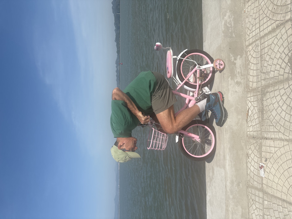 An older man rides a small, pink bicycle with training wheels along a waterfront. He wears a green shirt, khaki shorts, a baseball cap, and hiking boots. The bike has a front basket. The background includes a body of water, mountains in the distance, and a clear blue sky. The man is on a concrete path adjacent to the water. The image is rotated, with the sky on the left side.