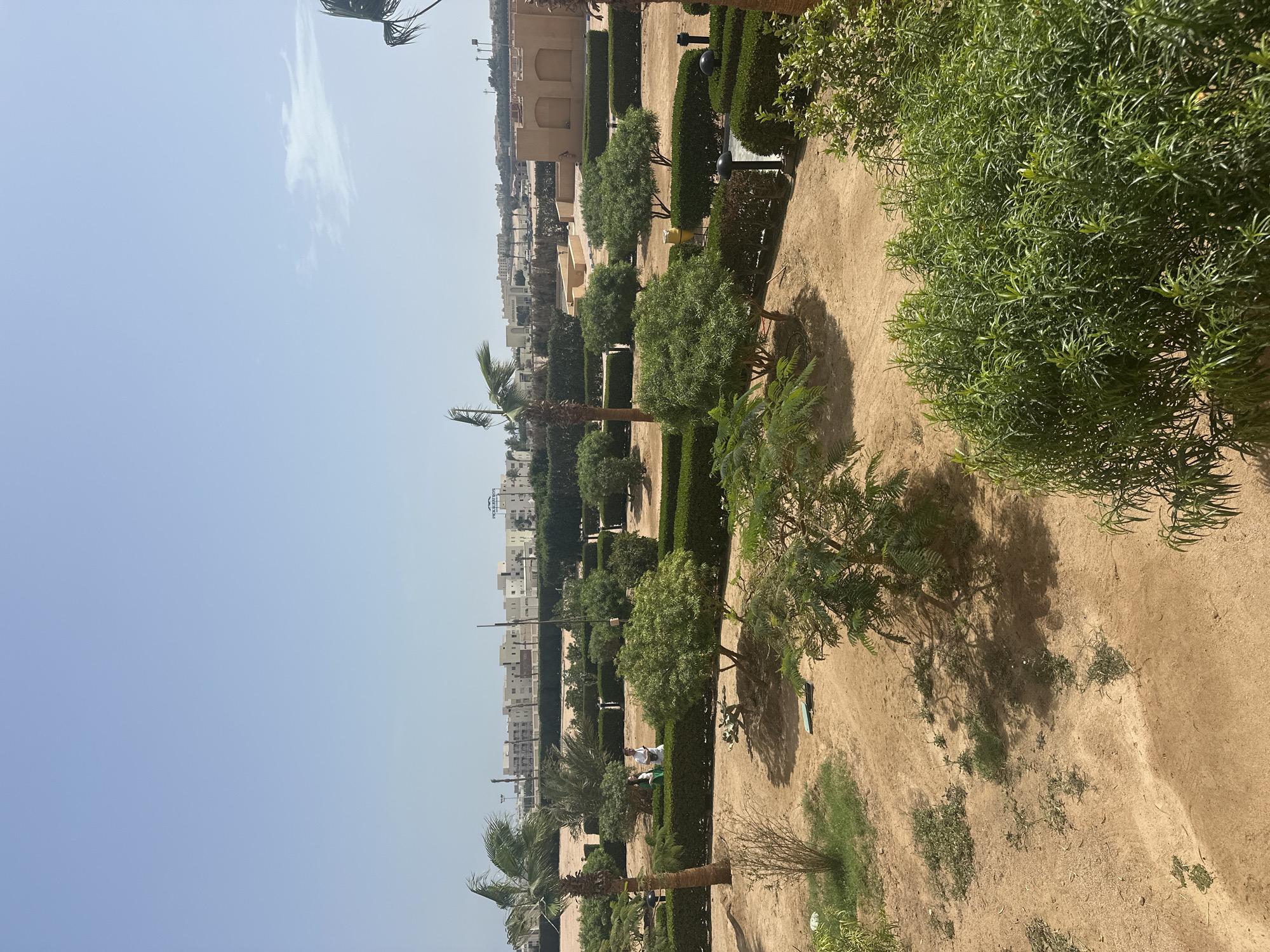 A low-angle shot reveals a park scene in the city of Unknown, Egypt. The frame is split between the pale blue sky with a few thin clouds and the sandy, tree-lined landscape. A row of trimmed green hedges and diverse trees, including palms, stretches along the left side of the frame. In the background, buildings of varying heights, mostly light in color, are visible. The ground is predominantly sandy with sparse patches of grass and vegetation. The scene conveys a sense of urban landscaping in a desert climate.