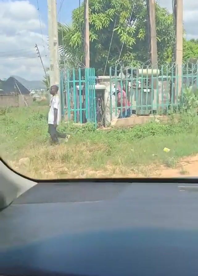 The video is shot from inside a car, focusing on the roadside view through the passenger side window. In the foreground, there's a green, grassy area with scattered patches of dirt and weeds. Several utility poles are visible, supporting a network of electrical wires. Beyond the grassy area, a light blue metal fence surrounds an electrical transformer or similar utility equipment. The fence is topped with barbed wire. Several people can be seen either inside or near the fenced area, their actions unclear due to distance and obstructions. A man in a white shirt and dark pants is briefly seen walking away from the fenced area. The car is moving forward during the recording. In the distance, there are buildings and a tree line. The sky is partly cloudy.