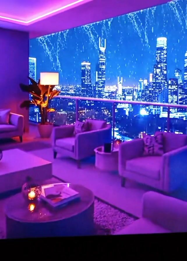 room with a view of the Tokyo skyline at night. The room is decorated with purple furniture and a neon sign that says "lofi sky." There is a sofa, armchairs, coffee tables, and a plant. The room appears to be on a balcony, with a glass railing overlooking the city. It is raining or snowing heavily over the cityscape.