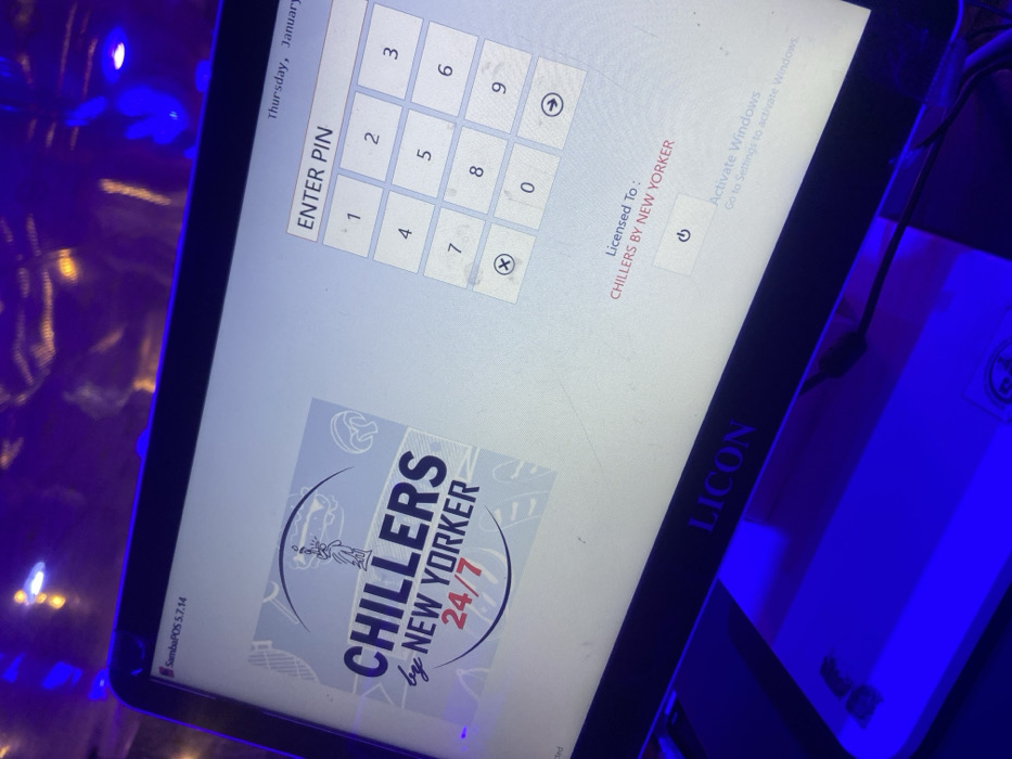 tablet screen displaying a login interface. The screen is branded with "CHILLERS by NEW YORKER 24/7" logo and a numeric keypad is prompting for a PIN entry. The tablet's OS is identified as SambaPOS 5.7.14. It also mentions "Thursday, January", which may be the date. Windows activation is needed and the tablet is branded with "LICON" on the side. The device is licensed to "CHILLERS BY NEW YORKER".