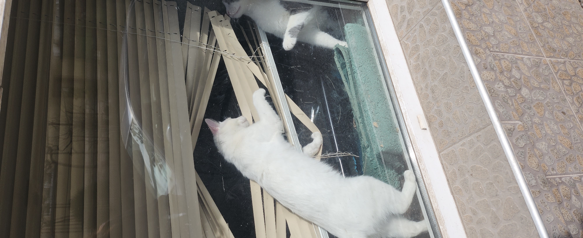 The image captures an exterior view looking inward through a window, observed from an elevated or ground-level perspective. A white domestic cat stands on its hind legs inside, with its front paws extended and interacting with light-colored horizontal window blinds that appear dislodged and bent. Behind the cat, the interior floor is dark. A damaged, elongated green object rests on the interior window sill or floor, near the bottom of the frame. Reflections in the window glass include the roofline of a dark-colored vehicle and indistinct shadows resembling foliage in the upper portion. A secondary reflection of a gray and white cat, potentially interacting with the green object, is visible in the lower right quadrant of the glass. The exterior ground directly below the window consists of light-colored, textured concrete pavers. Below these pavers, the building's exterior wall is faced with decorative tiles simulating small, multi-colored stones, primarily beige, brown, and gray. A thin, horizontal metallic railing is situated along the base of this tiled wall. The scene is illuminated by natural daylight. While no specific landmarks are visible, the building materials and style are consistent with residential or commercial architecture found in urban environments such as Ruse, Bulgaria.