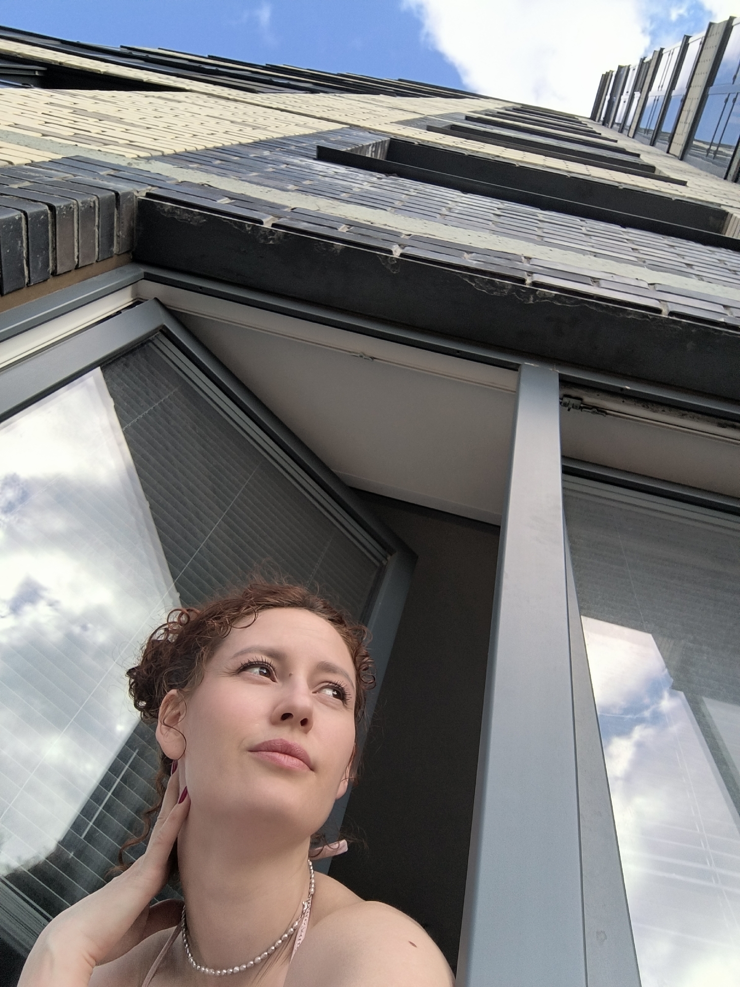 A low-angle, upward-looking photograph depicts a female subject positioned at an open window or balcony of a modern building in Saint Petersburg, Russia. The individual, a light-skinned female with curly reddish-brown hair, is visible from the upper chest upwards, wearing a light-colored top and a silver-colored pearl necklace. Her right hand is raised, with fingers gently touching the right side of her neck. Her gaze is directed upwards and to the right, towards an unseen point beyond the frame. The dominant background features the exterior of a multi-story building, composed of alternating horizontal bands of light beige and dark grey/black brickwork. The building recedes sharply upwards, framed against a clear blue sky with scattered white clouds. Large windows with grey/silver frames are visible, some reflecting the sky and clouds, while others reveal horizontal blinds or interior darkness. The perspective emphasizes the building's height and modern architectural style. Natural light indicates daytime conditions, with distinct shadows cast on the building's facade. The precise location within Saint Petersburg is not discernible from the visual information provided.