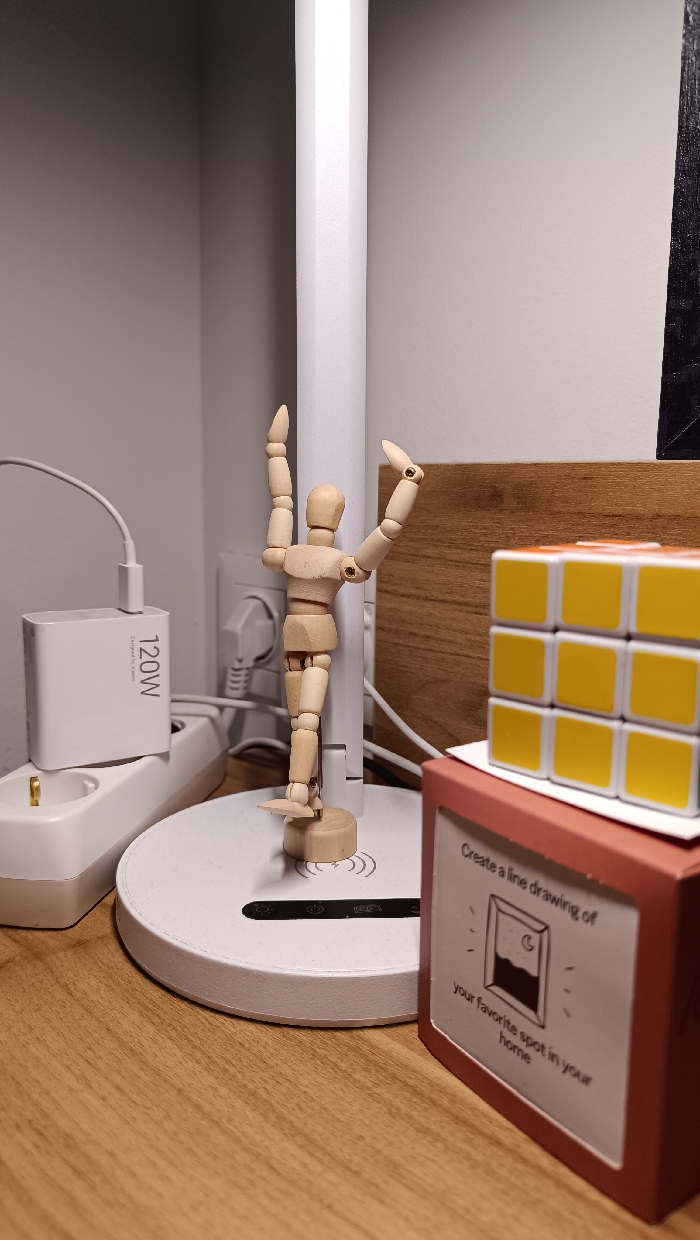 The scene is an interior view within a building in Sabadell, Spain, displaying a segment of a wooden surface, likely a desk or shelf. A small, light-colored wooden artist's mannequin stands centrally on a white circular base that features a wireless charging symbol and control icons. The mannequin is posed with both arms raised vertically above its head and hands open. To its immediate left, a white power strip with a European two-pin socket is visible, into which a white 120W Xiaomi power adapter is plugged. A white cable extends upward from the adapter, and another white power cable is connected to a wall outlet behind the power strip. A tall, slender white desk lamp stand rises directly behind the mannequin and its base. To the right of the mannequin, a Rubik's Cube, showing yellow and white faces, is positioned on top of a reddish-brown rectangular box. The visible face of this box features a label that reads, "Create a line drawing of [illustration of a window with a moon] your favorite spot in your home." The items are arranged on a light brown wooden surface. The background consists primarily of a light gray wall, with a section of a light brown wooden panel visible behind the Rubik's Cube and a dark, indistinct object partially visible on the far right.