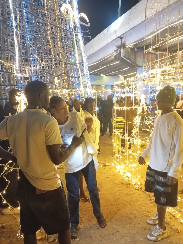 A group of people stands amidst a display of lights at night. A tall, cone-shaped structure covered in blue and white lights dominates the left side, contrasting with the warm yellow lights arranged in cube shapes on the right. Individuals are dressed casually, with some in white shirts. A concrete overpass looms in the background. The scene seems festive, with people possibly enjoying the light display.