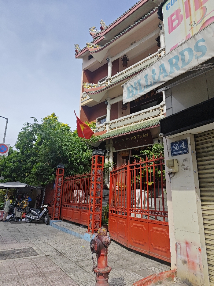 A multi-story building stands behind a red metal gate with decorative pillars. A Vietnamese flag waves above the entrance. Signage above indicates "Billiards" and the building's address as "Số 4". The street scene includes a fire hydrant, a motorcycle parked near a small vendor stall, and sections of sidewalk. Green trees partially obscure the building, and the sky is visible above.