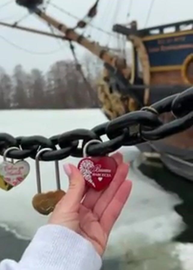 A hand holds a red, heart-shaped padlock with the words "Vmecte Navsegda" written in Cyrillic script, attached to a chain with other locks. The chain is likely part of a bridge or barrier, and in the background, there is a body of water partially covered with ice and a large, old-fashioned ship. The sky is overcast.