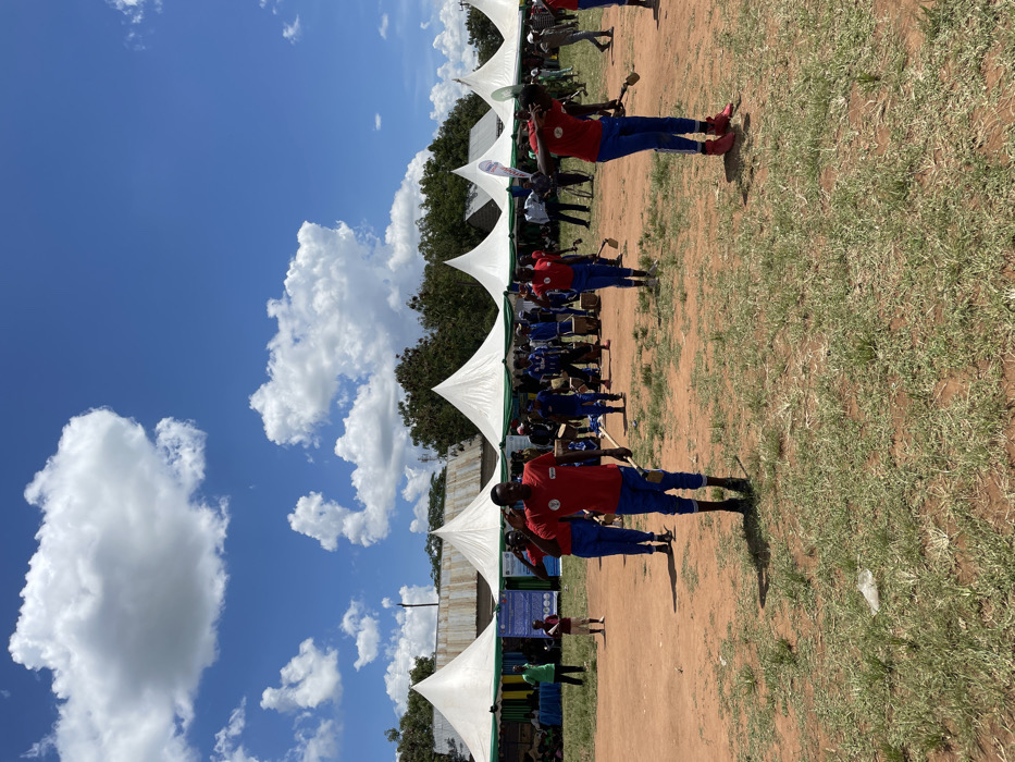 group of people, mostly young men, standing in a field. They are wearing red shirts and blue pants, and some are holding wooden sticks. The men are standing in front of a row of white tents that are set up in a field. The field is covered in red dirt and green grass. The sky is blue with white clouds. The image was taken in Bariadi, Tanzania, at latitude: -2.797, longitude: 33.991. The men are likely participating in a sporting event or cultural performance.