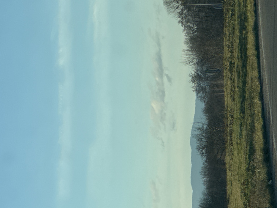 A pale blue sky with faint, wispy clouds dominates the left of the frame. Along the right edge, a road borders green and brown grassy areas, transitioning into a line of bare trees. A distant mountain range is subtly visible between the trees and the sky. A road sign can be seen among the tree tops.