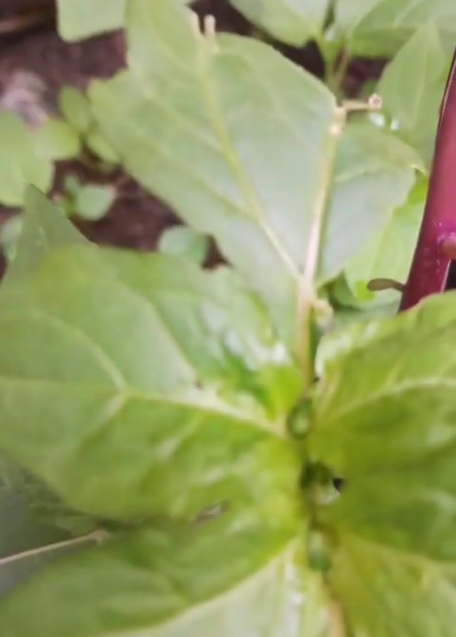 The camera focuses on a plant with green leaves, some of which have holes. The plant has a reddish-purple stem and appears to be growing in a white fabric container. The background is blurry, but suggests the presence of other plants.