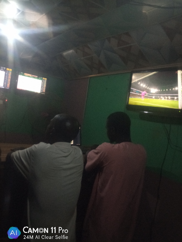 Inside a dimly lit room, two individuals are seated. One wears a white shirt and the other a pink one. Two screens display betting odds or market data on the left. A larger television on the right shows a soccer game. The room has green walls and a patterned ceiling. The "CAMON 11 Pro" watermark is visible in the lower left corner.