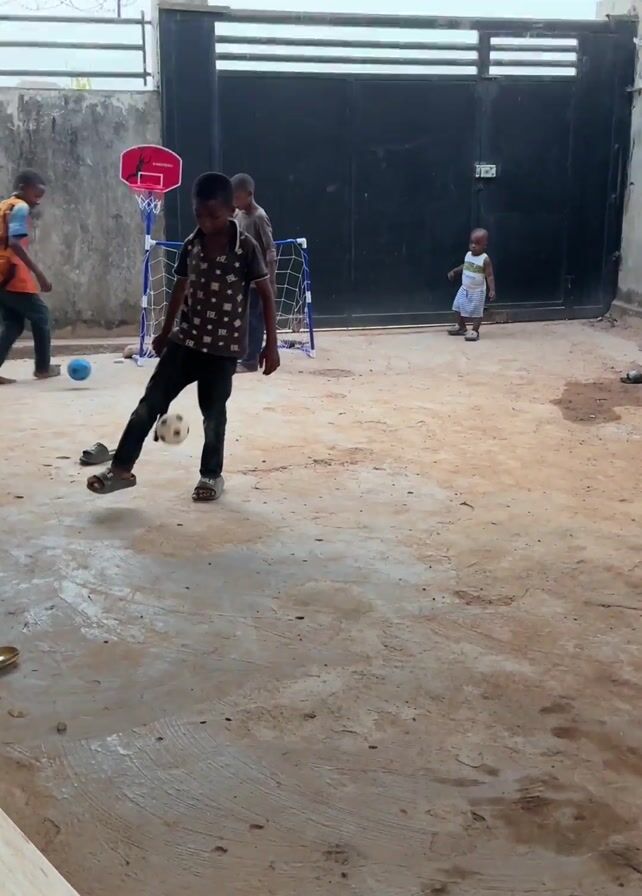 Four young boys are playing outdoors in a fenced-in courtyard. One boy dribbles a soccer ball near the center of the space. Another boy stands near a small soccer goal with a basketball hoop attached to the top. A third boy is dribbling a blue ball on the left side of the frame. A toddler stands near a large gate in the background. The surface of the courtyard is uneven and sandy-colored. Sandals and other objects are scattered on the ground. A stack of wooden boards lies in the bottom left corner of the frame. The sky is visible through a partially covered roof above.