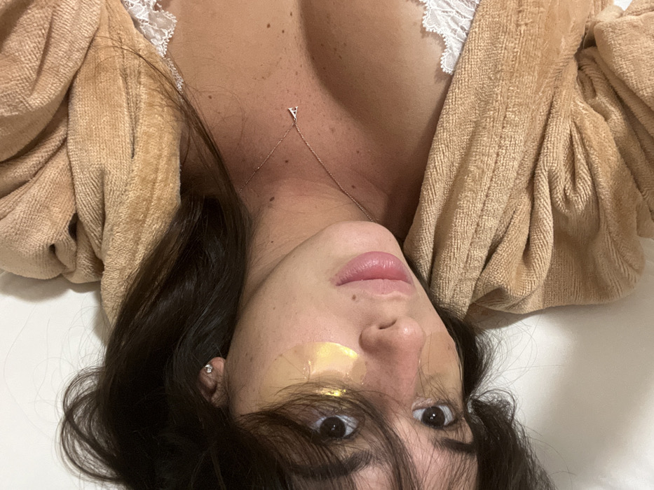 A woman reclines in a beige robe, her dark hair framing her face. She is wearing a delicate necklace with a small "V" pendant. Her lips are full and pink, and she has a gold under-eye mask applied. She is looking directly at the camera. A hint of white lace is visible beneath the robe, suggesting lingerie.