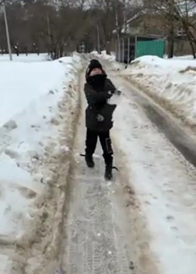 A child bundled in a black winter coat, hat, and scarf walks along a snow-covered road. The road, narrow and slightly icy, is flanked by piles of snow tinged with dirt and mud. Bare trees stand stark against the overcast sky in the background. The child occasionally turns towards the camera. Some buildings are also visible in the background.