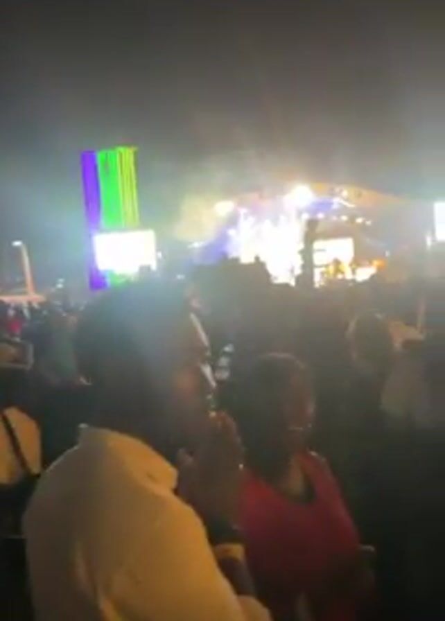 large crowd of people at an outdoor concert at night. A brightly lit stage with screens is visible in the distance, and there are tall structures with colored lights on the left. The camera focuses on the backs of people in the foreground, some of whom are holding up their phones. People are standing and talking. The overall atmosphere appears energetic and lively.