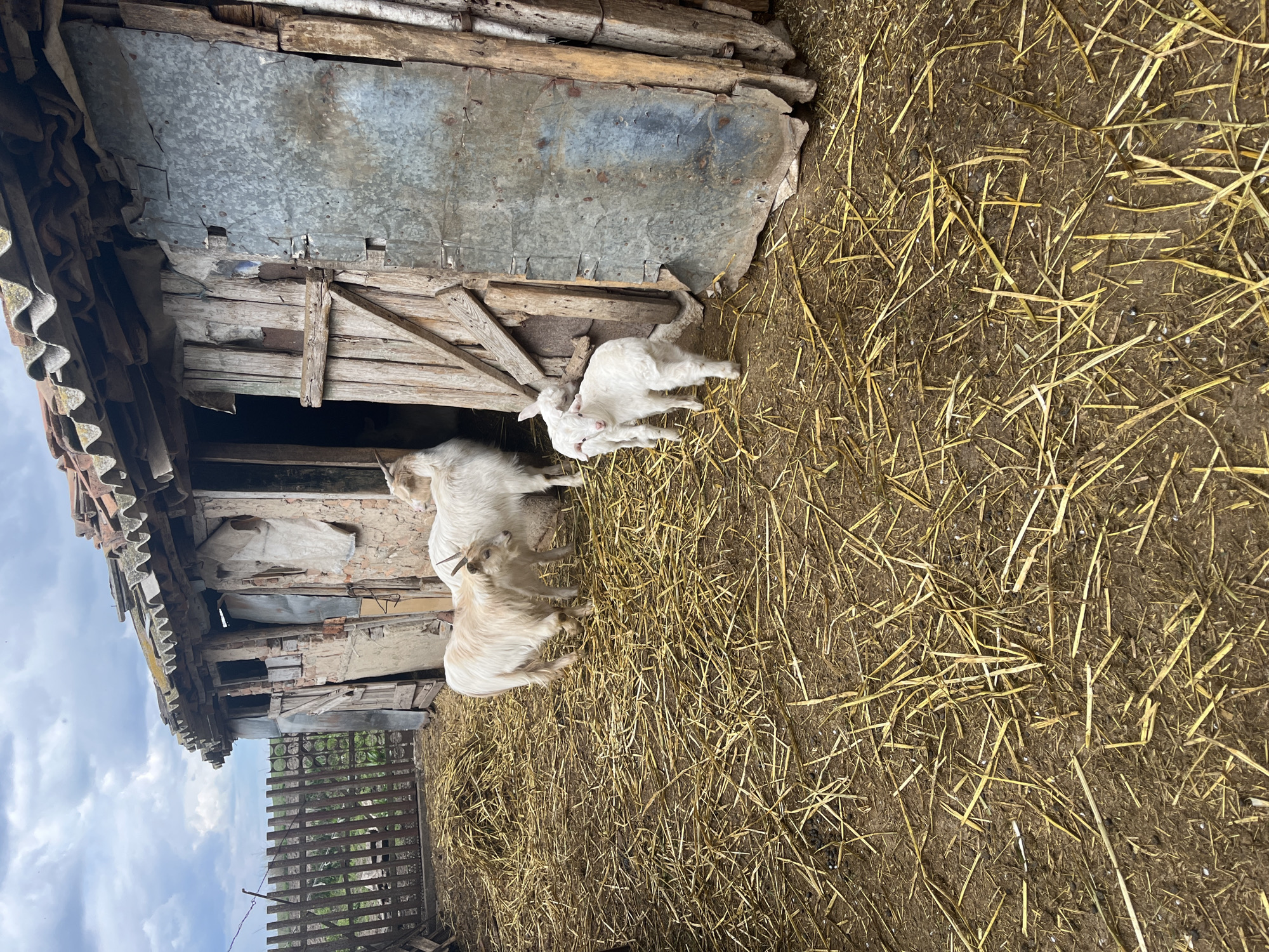 rustic barn setting, possibly in a rural area. Three goats are visible: two are young and white, standing near a weathered wooden and sheet metal structure; the third goat is larger and tan-colored, slightly separated from the others. Straw covers the ground. A weathered wooden fence is partially visible in the background, and the sky is overcast. The scene could potentially be in Tsarevets, Bulgaria, given the context.