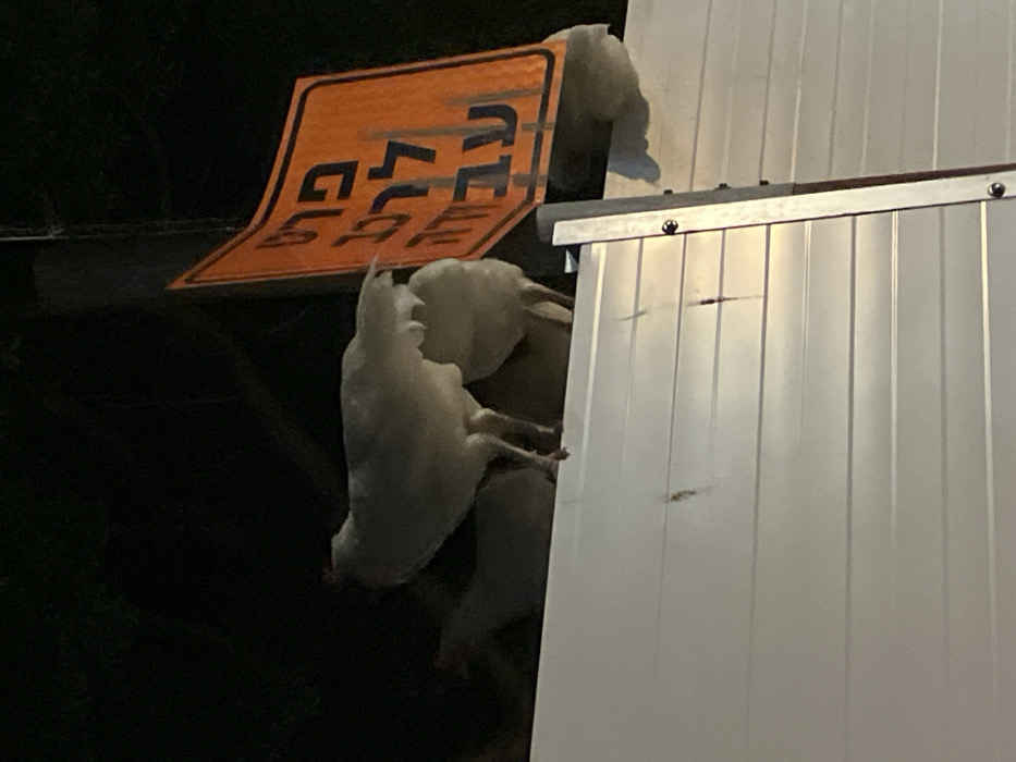 Three white chickens perch precariously near the corner of a white, vertically-paneled building. An orange road sign reading "CLEARANCE" in reversed, dark lettering is positioned close by. The background is dark, suggesting nighttime. The chickens are clustered closely together, their bodies appearing huddled for warmth or support. The scene is unusual, raising questions about how the chickens came to be in this location.