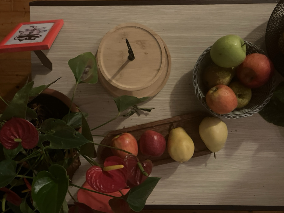 The scene depicts an overhead view of a table in Podličak, Montenegro, showcasing a collection of household objects and fruit arranged on a light-colored, possibly wooden, surface. In the upper left quadrant, a potted anthurium plant with dark green leaves and multiple vibrant red, heart-shaped spathes featuring prominent yellow spadices is present. Some leaves exhibit minor perforations. Adjacent to the plant, extending downwards, a dark brown rectangular wooden serving board holds four pieces of fruit: two reddish-orange apples at the top and two light yellow pears below them. To the left of the board, a single light yellow pear rests on the table surface. To the right of the plant and partially above the wooden board, a round, light wood-toned object resembling a clock face is visible, featuring two black clock hands. The hands indicate approximately 7:45 or 8:45, with the shorter hand near the eight o'clock position and the longer hand near the nine o'clock position; no numerals are present on the face. Above and to the right of the clock, a small, bright red picture frame stands upright, displaying a monochrome image of two stylized figures, possibly pigs. In the lower right quadrant, a round, light gray woven basket contains five pieces of fruit: one green apple, one red apple, two reddish-orange apples, and one yellowish-green pear. The background beyond the immediate table surface is dark and indistinct. Lighting suggests an indoor environment, casting soft shadows.