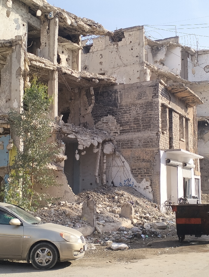- "The image displays a street scene in Ad Duwayr, Syria, featuring heavily damaged multi-story residential or commercial buildings" by FM-4RDN43, licensed under CC BY 4.0
