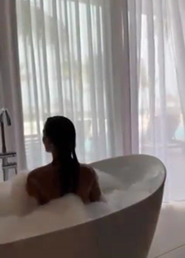 A woman is sitting in a bubble bath, facing away from the camera, then turns her head slightly to the left