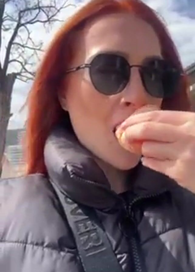 A woman with auburn hair, wearing black sunglasses and a black puffer jacket, is walking outdoors and eating a tangerine section. She bites into the tangerine, chews, and displays the rest of the section on her tongue before speaking. The sky is visible with clouds, and trees and a building can be seen in the background.
