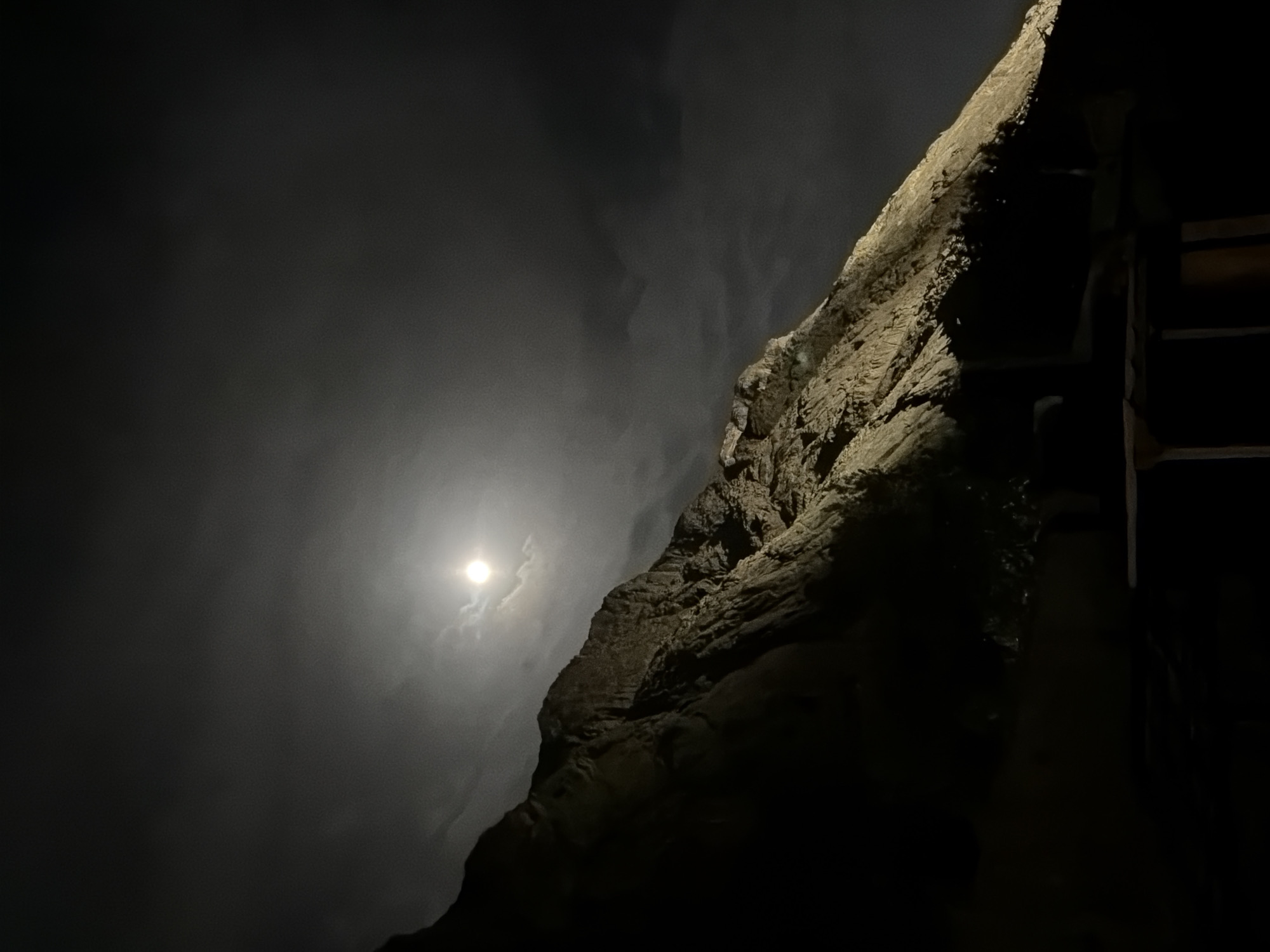 A nighttime photograph shows a bright full moon in a cloudy sky beside a large rocky formation. The moon is centered on the left side of the frame, illuminating the surrounding clouds. The rock formation, likely a part of the Sinai mountains, occupies the right side of the photograph and is lit from the top, casting deep shadows on its textured surface. A wooden structure is partially visible on the right side, with straight edges running along the right side of the frame. The scene appears to be in Saint Catherine, Egypt, based on the landscape and architecture typically found in that region. The time of day is night, and the only light source is the moon.