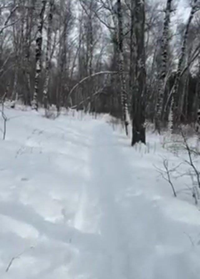 snowy trail through a birch forest. The path is well-trodden and the snow is relatively untouched on either side. Tall, bare birch trees line the trail, their white trunks and dark branches creating a stark contrast against the snow. The sky is overcast, providing soft, diffused light. The camera appears to be moving forward along the trail, suggesting a person is walking or filming while traveling the path.