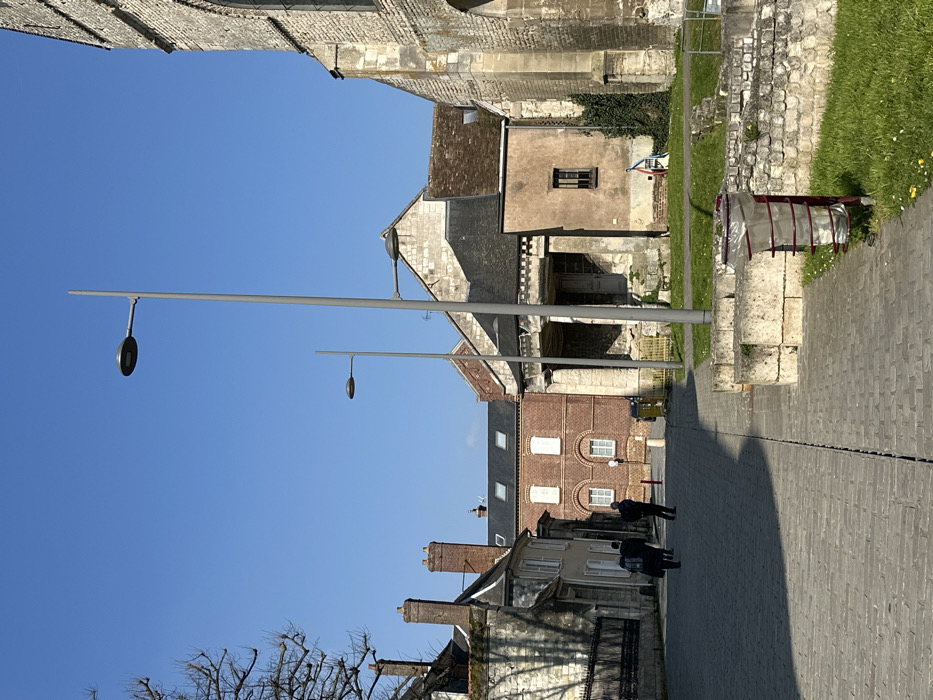 This image captures a street scene on a clear, sunny day in the city of Beauvais, France. The perspective is from a paved street, looking eastward towards a complex of historic buildings. In the foreground, a gray cobblestone or paver-laid street extends into the distance, with a linear drainage grate running along its center. Shadows from unseen objects to the left extend across the pavement. On the left side of the street, three individuals, likely adults, are observed walking away from the camera. They are dressed in dark coats; one appears to be carrying a backpack. Their interaction is limited to shared movement along the street. The bare branches of a deciduous tree are visible on the far left, casting shadows on a light-colored building with a dark roof and chimneys. Adjacent to the paved area on the right, a grassy strip contains remnants of low, light-colored stone walls. A maroon-colored, open-ribbed metal trash receptacle with a clear plastic liner is positioned within this grassy area, near the stone wall. The midground features a collection of architectural structures. On the left, beyond the pedestrians, several multi-story buildings with varied facades (stone, stucco, and red brick) and tiled or slate roofs line the street. A prominent red brick building with white-shuttered windows and dormer windows under a dark roof is visible further down the street. Two modern, gray streetlights with cylindrical fixtures are spaced along the right edge of the paved street, with the taller one closer to the viewer. On the right side of the image, a large, light-colored stone building, characteristic of historic religious architecture, features a prominent arched window and buttressing. Adjoining this structure is a smaller, weathered building with a portico supported by columns and a tiled roof, which connects to a simpler, stucco-finished building with a single rectangular window. Yellow bollards or barriers are positioned near the base of the portico structure. The background consists of a clear, cloudless blue sky, indicating bright daylight conditions. Shadows are distinct and sharply defined, suggesting the sun is positioned to the left and slightly behind the camera's perspective. The overall scene depicts a quiet urban setting dominated by historical architecture under a clear sky.