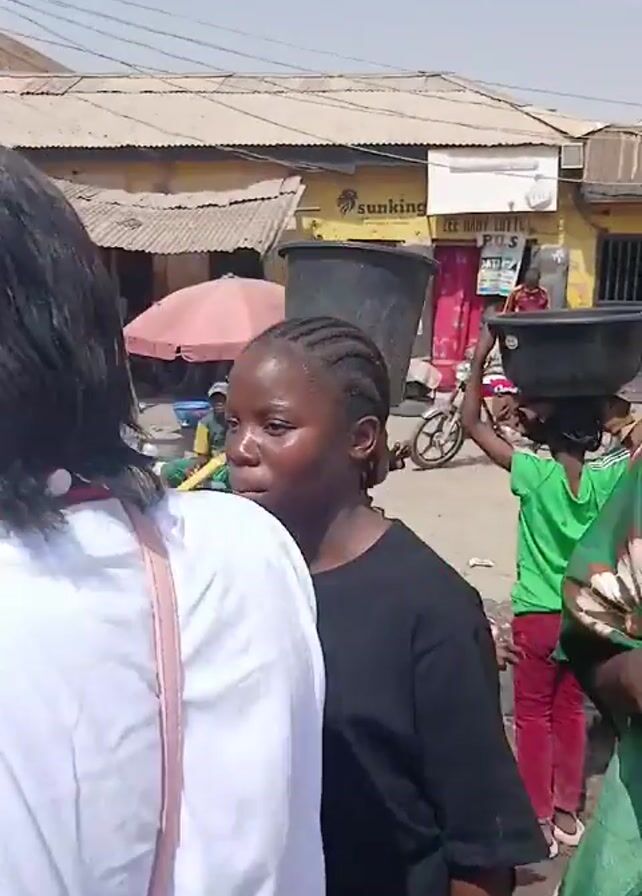 group of children carrying buckets of water on their heads in what appears to be a public area