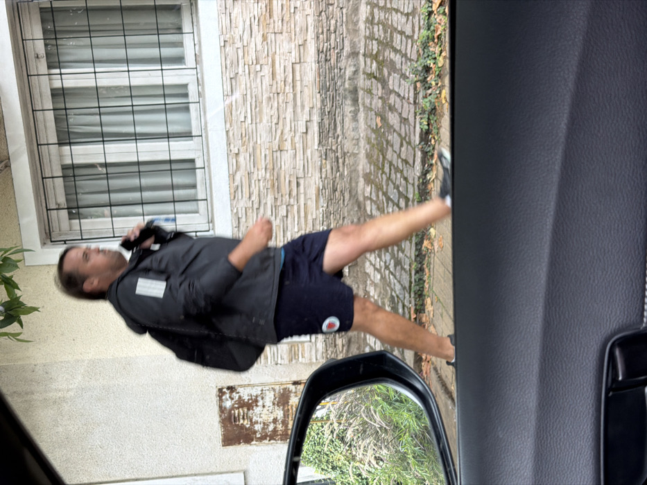 A man wearing dark shorts and a jacket stands outdoors, possibly talking on the phone. He is partially visible through a car window, which frames the scene. A rearview mirror reflects greenery. The background includes a brick wall, a barred window, and a section of cobblestone or paved ground with foliage along the edge. The image appears to be taken from inside a vehicle.