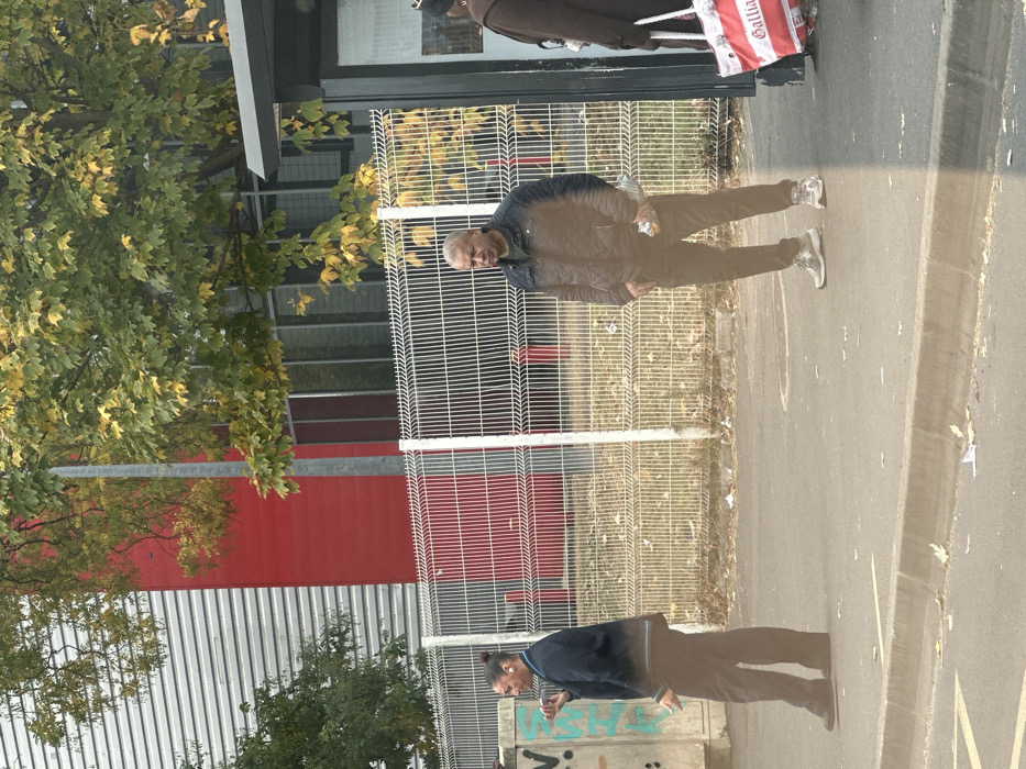 The image displays an outdoor urban scene in Stains, France, under overcast daylight conditions, featuring autumnal foliage. Three individuals are present on a paved sidewalk or street edge. On the left, a person, appearing female, with dark hair pulled back, stands in profile, facing right. She wears a dark blue, long-sleeved top with a light stripe and dark trousers. A white earbud is visible in her right ear, and she holds a small, light-colored object to her mouth. In the center, a middle-aged man with short, graying hair stands facing slightly left. He is dressed in a dark quilted jacket, a dark shirt, dark trousers, and light-colored athletic shoes. He holds a crumpled, light-colored object in his left hand. To the far right, partially obscured by a dark-framed bus stop shelter, another person, wearing a dark brown coat and a dark head covering, is visible from the chest up, holding a large red and white shopping bag with "Gallia" printed on it. The immediate foreground consists of asphalt pavement and a low curb, scattered with fallen leaves and small pieces of litter. Behind the individuals, a continuous white metal mesh fence separates the paved area from a strip of dry grass. Beyond the fence, a large building with sections of grey corrugated metal siding and red flat panels, along with windows, is visible. Green trees with yellowing leaves partially obscure the building and a grey utility pole. A concrete block with faded graffiti is present behind the leftmost individual.