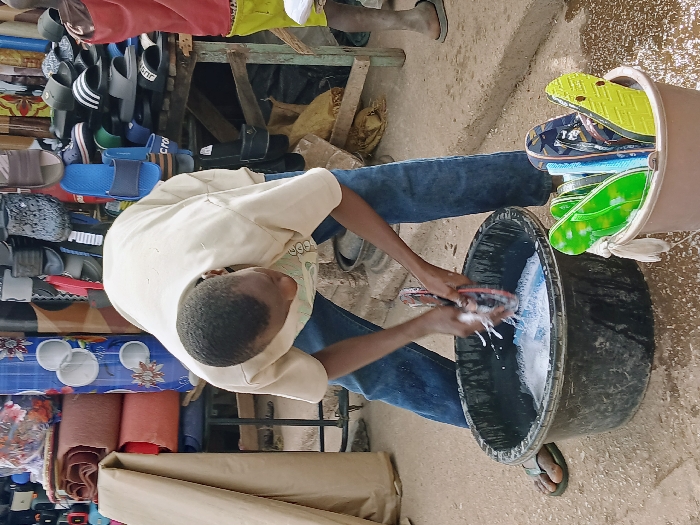 An outdoor market stall in Masvingo, Zimbabwe, features a male vendor actively washing footwear