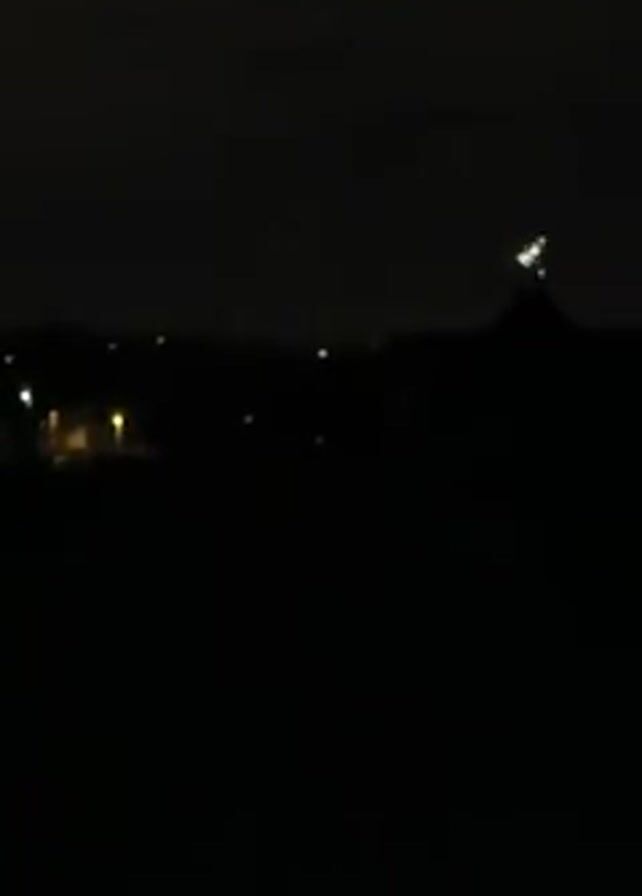 dark night scene. In the distance, several lights are visible, possibly from buildings. Above the horizon, a bright green light appears, then disappears, followed by a red light in a similar position. The scene is dark and somewhat grainy.