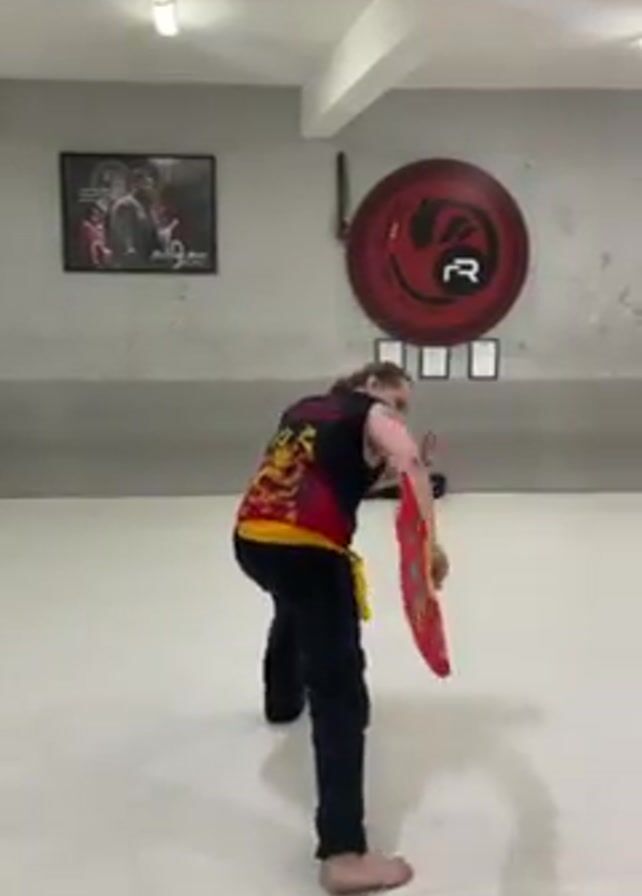 Here is a detailed description of the video: The video shows a man in a black vest, black pants, and a yellow belt demonstrating a martial arts move with a large red fan. The fan has a dragon design on it. He pivots and swings the fan in a defensive posture. The room is a training space, with a white floor and light grey walls. A black and white framed picture hangs on the wall, and a large red emblem with the letter "R" in the middle is displayed on the wall behind him. There are some kettlebells in the background as well.
