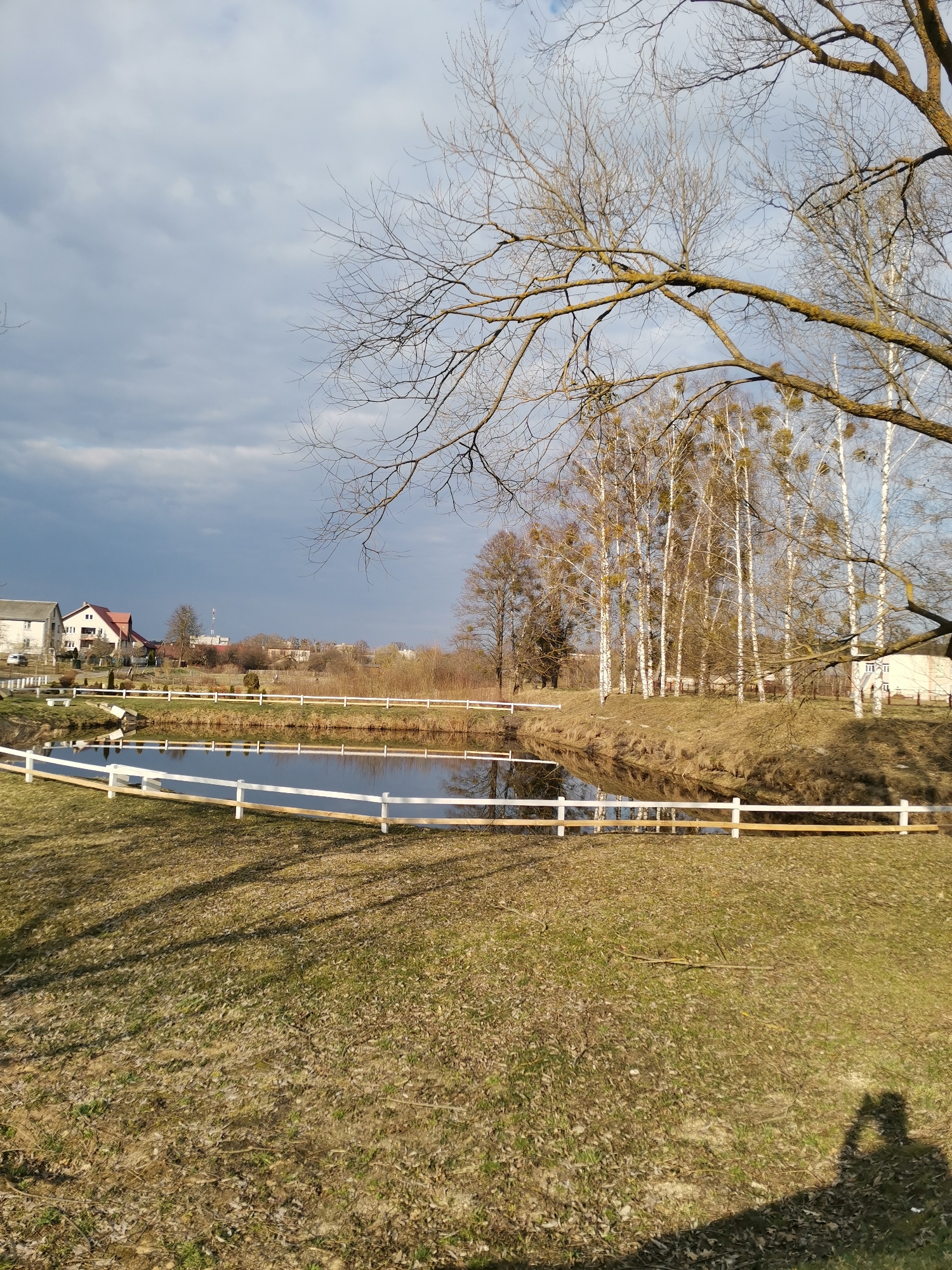pond in Парэчча, Belarus. The pond is surrounded by a white fence, and there are trees on the opposite bank, some of which appear to be birches. The grass in the foreground is dry and sparse, with patches of green. In the background, there are houses and other buildings. The sky is overcast, with a mix of dark and light clouds. The shadow of the photographer can be seen in the bottom right corner of the image.