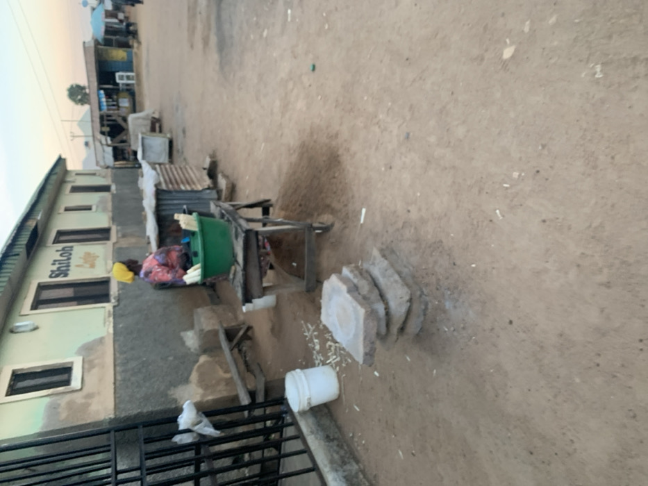 Location: Rafin Par, Nigeria. A forensic analysis of the image reveals an unpaved street scene in front of a building identified as "Shiloh Lodge." An adult female individual, wearing a yellow headwrap and a multi-colored patterned dress, is seated behind a makeshift wooden stall positioned on the dirt ground. The stall supports a large green plastic basin containing numerous peeled, white, cylindrical food items, consistent with root vegetables such as cassava. Below the stall, a small pile of dark earth or debris is visible. To the left of the stall, on the ground, a white plastic bucket is situated near a black metal gate or fence. Scattered white organic fragments, consistent with vegetable peelings, lie on the ground around the bucket. In the foreground, a stack of four irregular, flat grey stone or concrete slabs is centrally placed on the reddish-brown dirt. The "Shiloh Lodge" building, painted in light green and grey, features multiple dark-framed windows and doors. The unpaved road extends into the background, where additional single-story structures, some constructed with corrugated metal, are visible. The sky is a pale blue, suggesting either early morning or late afternoon lighting conditions.