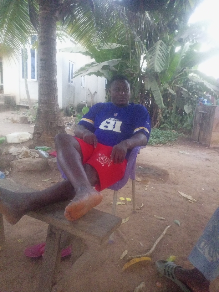 A man sits outside on a purple chair, wearing a purple and yellow football jersey and red shorts. He rests one leg on a wooden bench. Palm trees and other foliage are behind him, with a building visible in the background. The ground is sandy and covered with scattered debris like sticks and leaves. A pair of shoes are partially visible in the lower right corner of the frame.