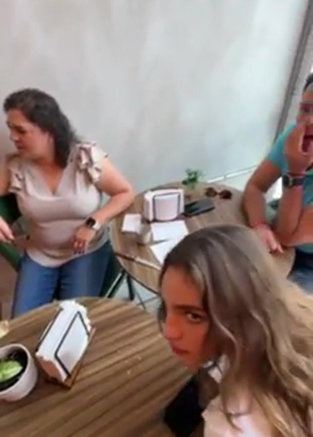 interior of a cafe. There are several small, round wooden tables with green chairs. People are seated at the tables, engaged in conversations. Some have drinks and napkins on their tables, along with cell phones and small potted plants. The cafe has a bright, airy atmosphere. The floor is tiled.