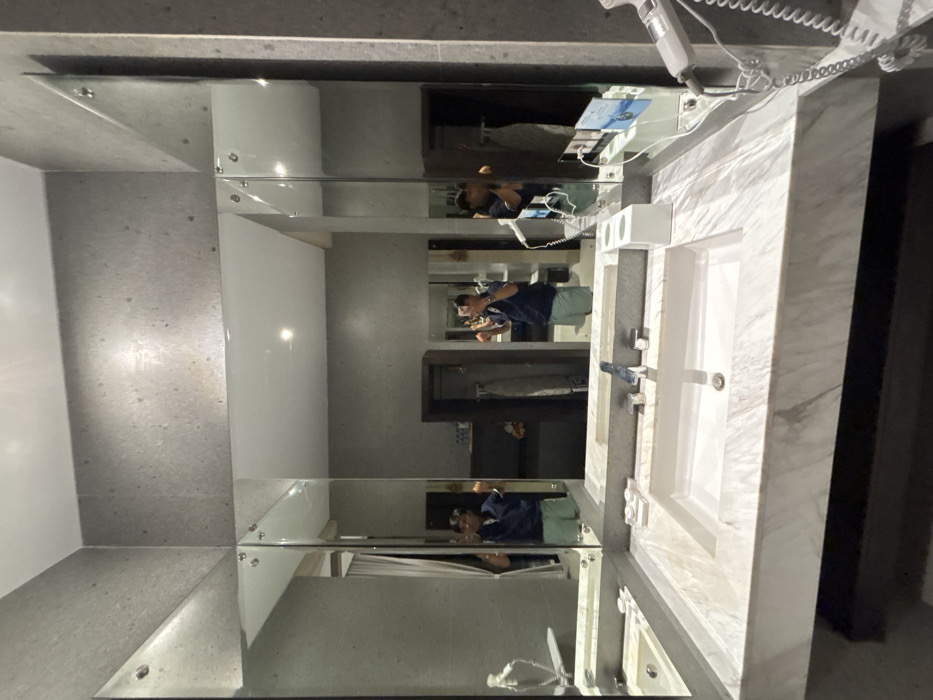 A person is seen taking a selfie in a modern bathroom located in Batuan, Indonesia