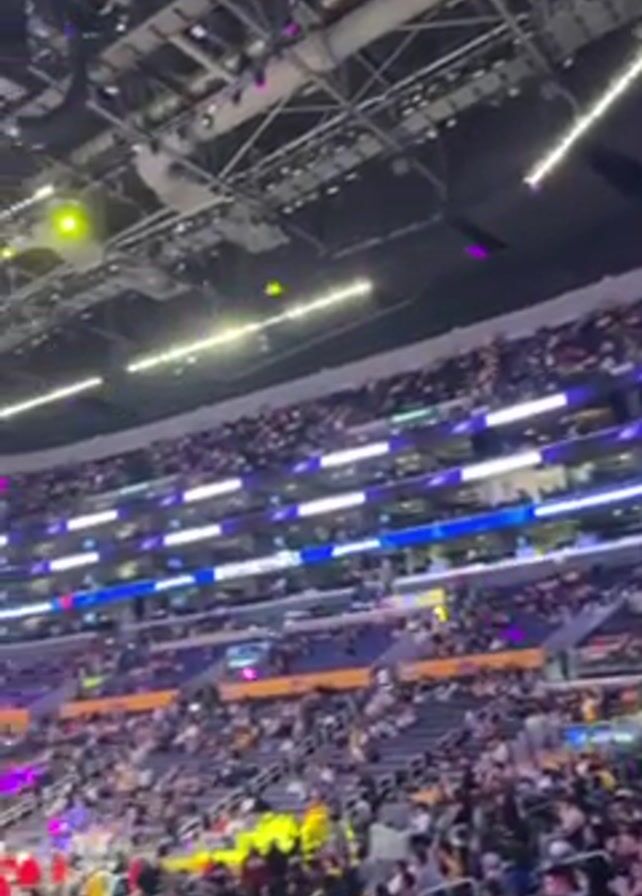 basketball game being played at the Crypto.com Arena. The stadium is filled with fans in the stands. There is a large video screen in the center of the arena displaying content. Players are on the court in team uniforms.