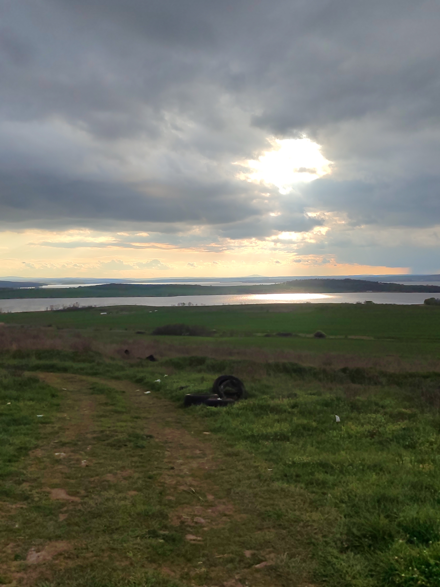 The image depicts a landscape near Tvarditsa, Bulgaria. In the foreground is a grassy field with a dirt path leading toward the middle ground. Several discarded tires are visible in the field, along with scattered trash. Beyond the field is a body of water, potentially a lake or reservoir. The water reflects the sunlight. The background features a strip of land on the far side of the water. The sky is overcast with heavy, dark clouds, but there is a patch where the sun is breaking through. The overall scene suggests a rural or semi-rural environment.