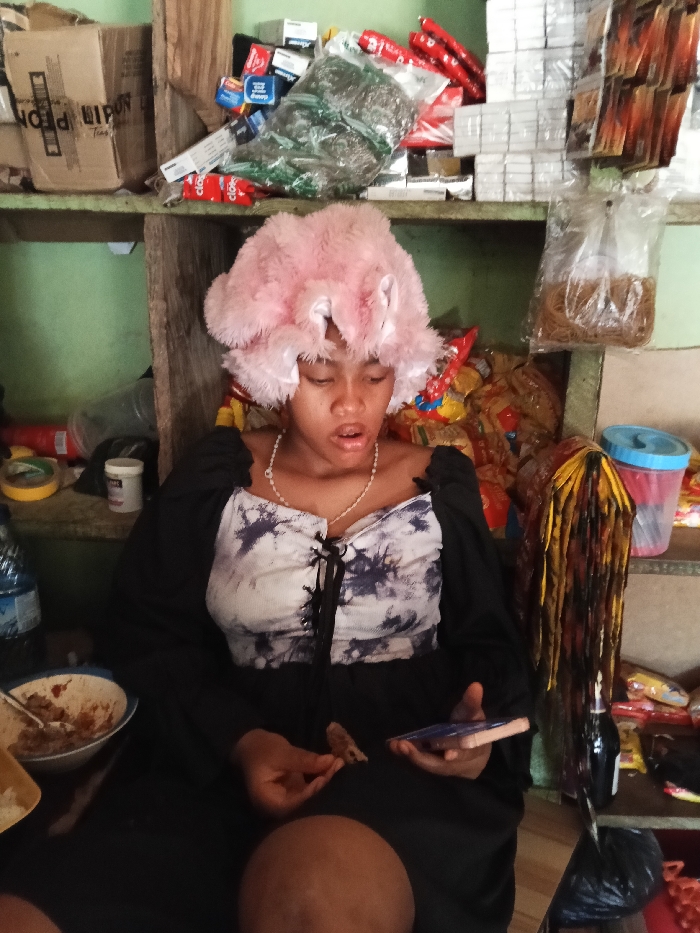 An interior scene within a cluttered retail shop or storage area in the city of Unknown, Unknown, features a young adult female seated, facing forward. She wears a black long-sleeved top with a white and blue tie-dye patterned bodice, featuring a black lace-up front, and a light pink fluffy bonnet. A white beaded necklace is visible around her neck. Her mouth is slightly open, suggesting she is speaking or reacting. In her right hand, she holds a small, irregular brown object, possibly food. Her left hand holds a light-colored smartphone. To her lower left, a white bowl with a blue rim contains a dark, textured substance and a spoon, alongside a light-colored rectangular dish. The background consists of light green walls with two visible wooden shelves heavily laden with various goods. The top shelf displays a cardboard box labeled "HIPUR," multiple clear plastic bags containing green plant material, numerous small boxes (some identified as "CLOSA" and "SAFE SEX" condoms), and other packaged items. The middle shelf, behind the subject, holds more plastic bags, one notably containing numerous brown rubber bands, rows of small white-packaged goods, and red-wrapped items. A lower shelf to the left holds a blue plastic water bottle, a white plastic container, and rolls of yellow and black tape. To the subject's right, a clear plastic container with a blue lid and a dark bottle are visible next to what appears to be a multi-colored wig or hair extensions with yellow, orange, and brown strands.