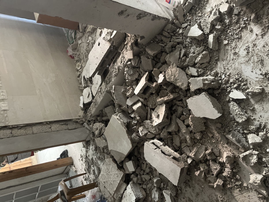 The image displays a room in disarray, likely undergoing demolition or renovation. Debris consisting of large concrete chunks, smaller fragments, and dust covers the floor. The remnants of a tiled wall are visible, along with a doorway or passage partially obstructed by the rubble. A chair and wooden beam are visible in the corner. The scene suggests a forceful destruction or removal of a wall or structure within the room.