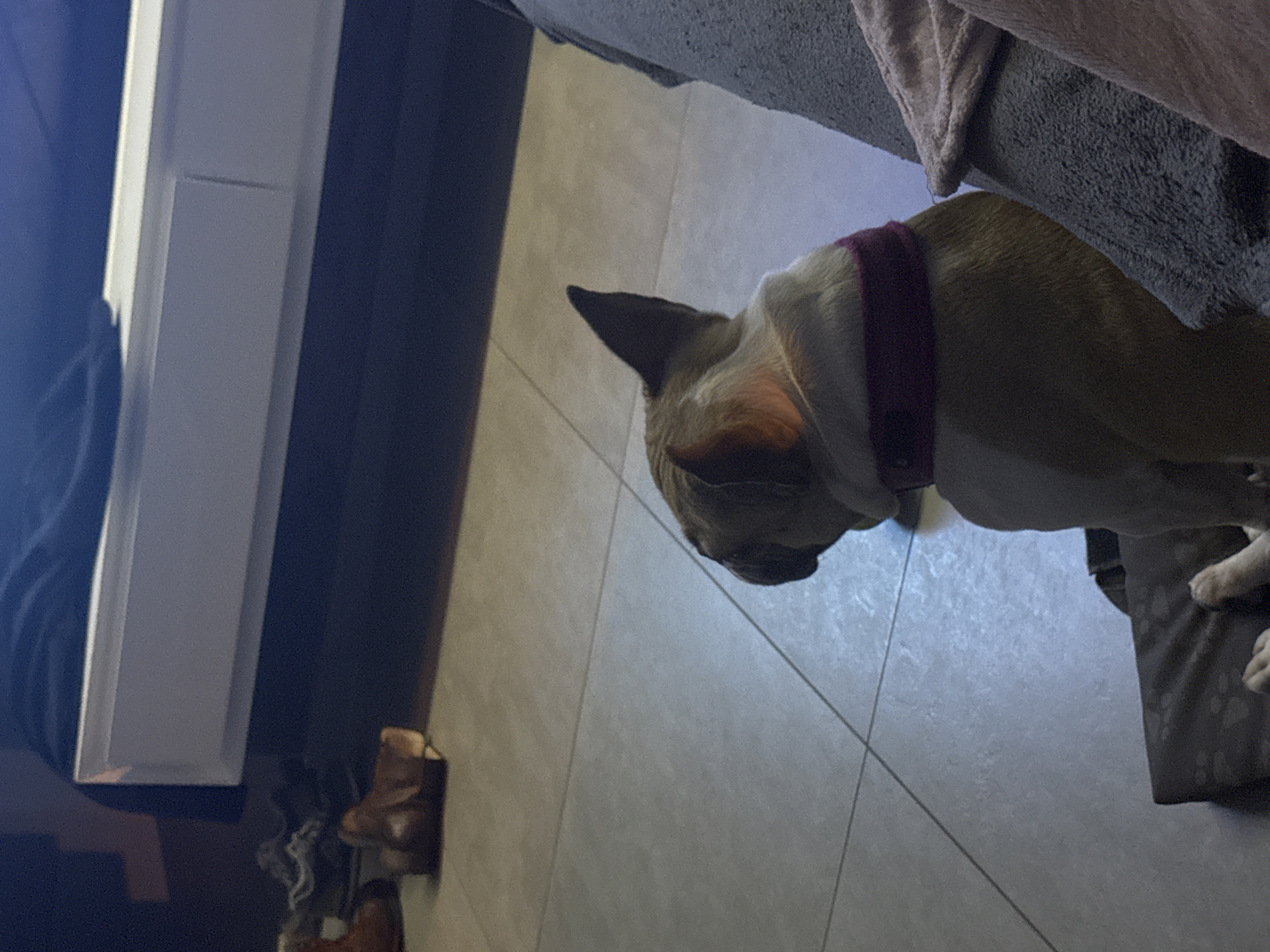 An indoor scene, location Unknown, Unknown, depicts a tan and white French Bulldog seated on a dark, patterned pet bed in the foreground. The dog, wearing a dark red collar, is positioned with its back to the viewer, head turned slightly left, observing an area out of frame. Its right ear shows a distinct orange glow from an unseen light source. The floor is composed of light-colored square tiles with dark grout lines. In the midground, to the left, several brown objects, including what appears to be a brown boot, are scattered on the floor. The background features a dark blue surface extending upwards, topped by a white, horizontal furniture unit, possibly a shelf or part of a bed frame. Above this unit, a dark blue fabric object is visible. To the immediate right of the dog, a portion of a textured grey upholstered furniture piece is visible, with a pinkish-brown blanket draped over it. The overall illumination of the scene is dim.