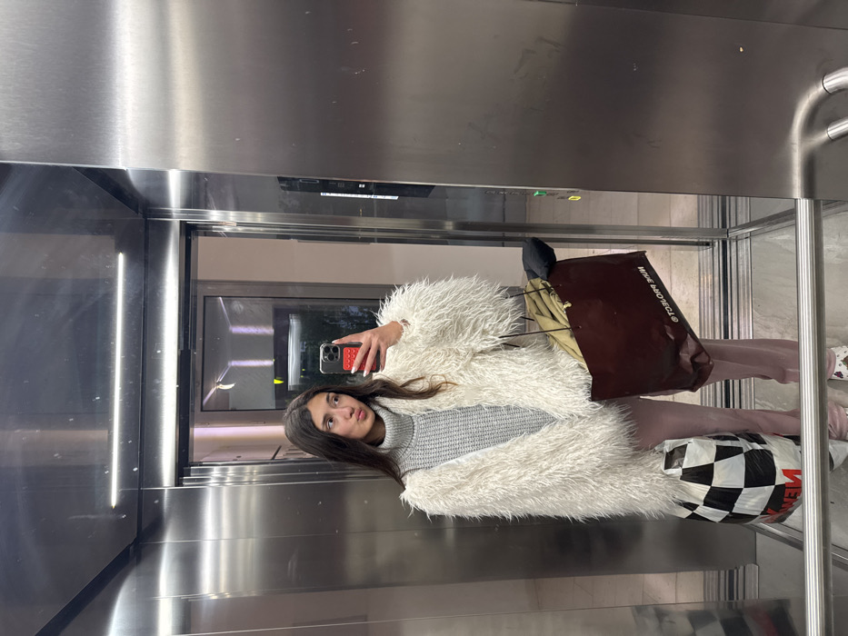 An individual is depicted taking a mirror selfie inside an elevator located in Donji Pobori, Montenegro. The female subject, positioned centrally, has long dark hair and is making a pouting expression towards the phone held in her right hand. She wears a grey turtleneck sweater, a white shaggy faux fur jacket, light pink trousers, and white Crocs. In her left hand, she holds a white and black checkered plastic shopping bag with partial text visible. A dark brown paper shopping bag, bearing the reversed text "MUSE PROJECT", is held by her right arm. The elevator interior consists of polished stainless steel panels, reflecting ceiling lights and an external hallway through the closed doors. A horizontal metal handrail is visible across the lower portion of the frame. An elevator control panel with green and yellow buttons is partially visible on the right wall.